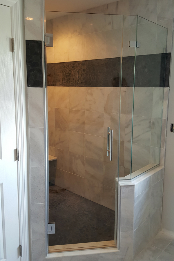 So many homes in the area have a master bathroom with this layout: a shower pan directly beside a soaking tub. This frameless glass corner shower enclosure is a great example of how homeowners can approach this layout. The door hinges off of the wet wall, and a notched stationary glass panel is cut out to accommodate the bathtub. A buttressed return panel completes the enclosure at 90 degrees, held securely in place by a corner clamp, as well as a glass-to-wall clamp on the back wall.