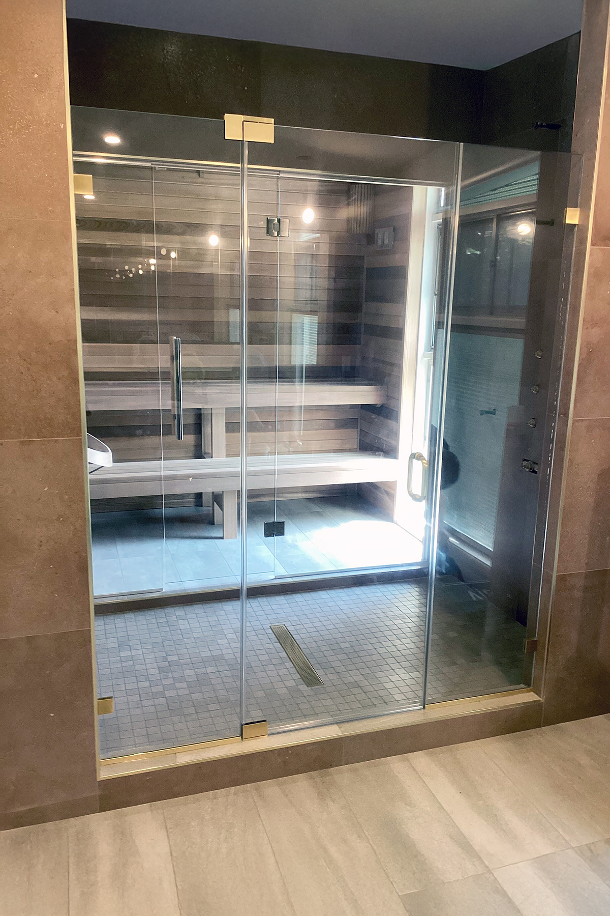 Panel-Door-Panel units with a metal header bar atop the unit, and pivot hinges at the top and bottom